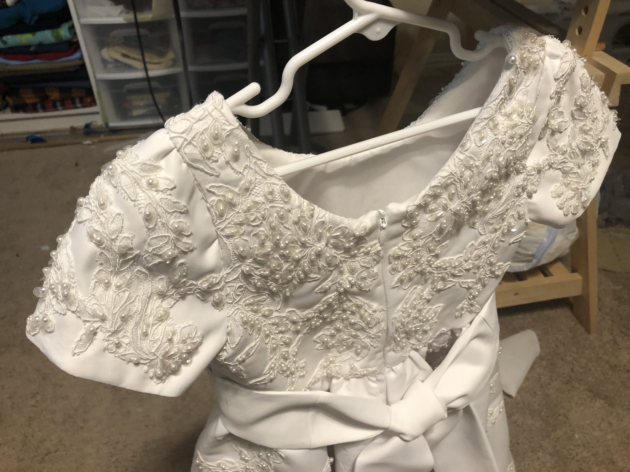 Alterations on matching flower girl dresses, both dresses started the same size and both were reduced to match the children's sizes