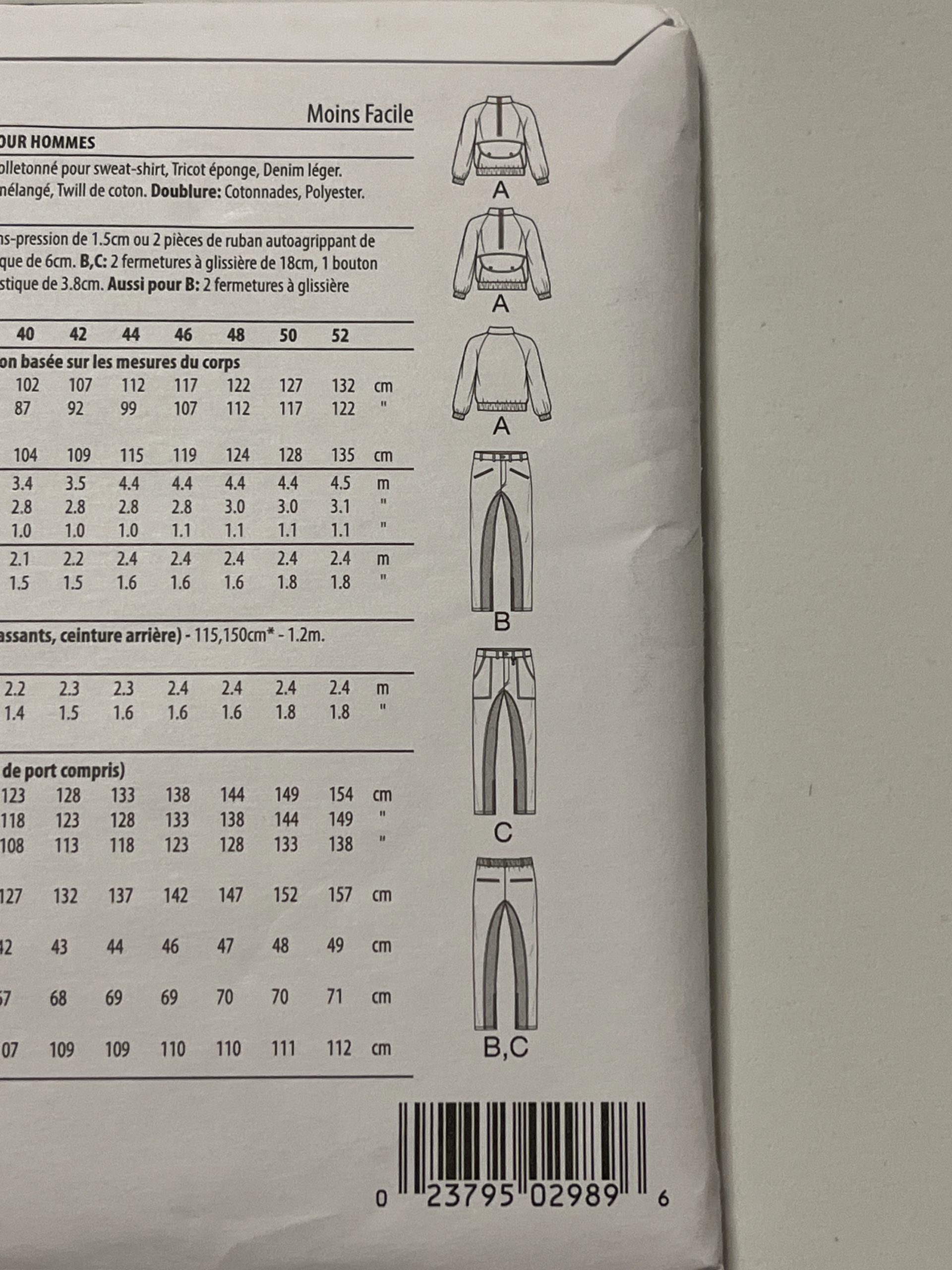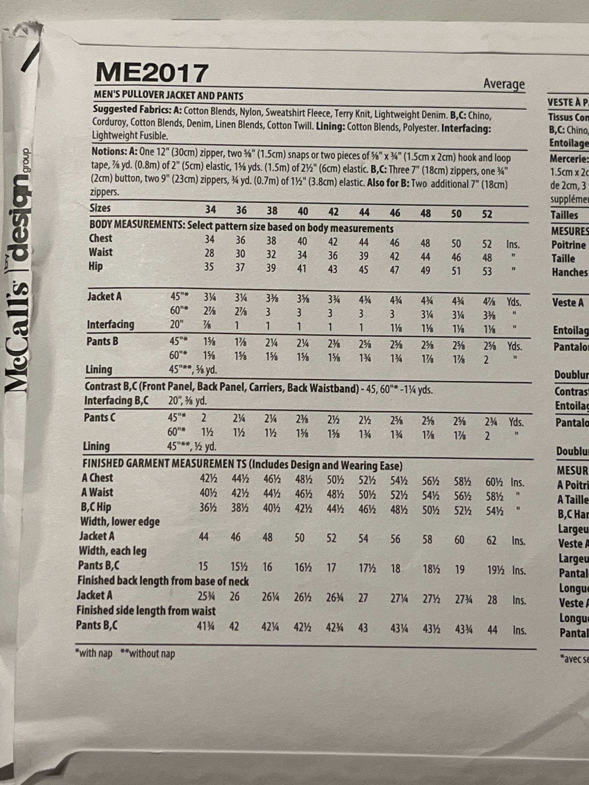 KnowMe ME2017 is suitable for a variety of light to medium-weight woven and stretch fabrics. The jacket is appropriate for fabrics such as cotton blends, nylon, sweatshirt fleece, terry knit, and lightweight denim. The pants may be constructed out of materials such as chino, corduroy, cotton blends, denim, linen blends, and cotton twill. Cotton blends or polyester is recommended for the lining, where indicated.